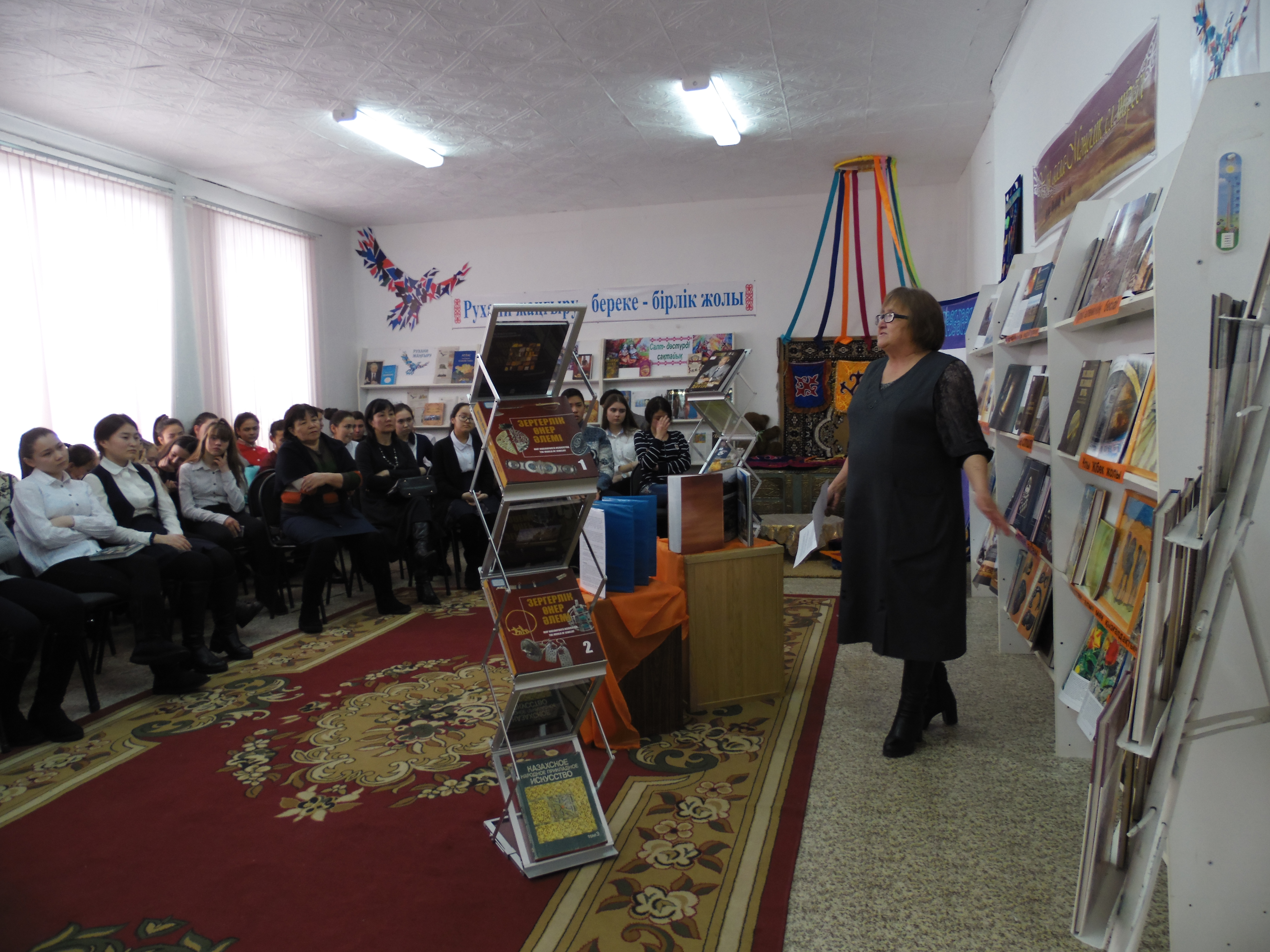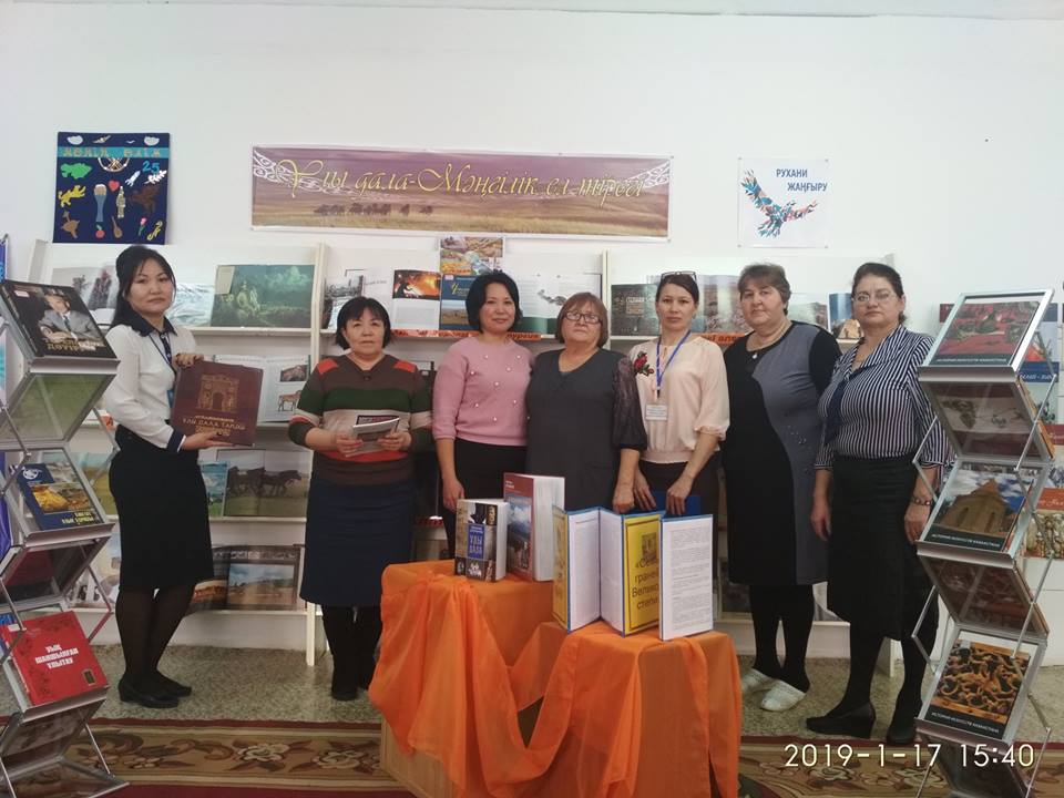 Аудандық кітапхананың кітапханашысы Рыспаева Бахыт Еділқызы «Ұлы дала –Мәңгілік ел тірегі» атты кітап сөресіне шолу жасады.Бұл сөреге тақырыпқа байланысты кітаптар орналысты.Сөре келесі бөлімдерден құрастырылды:«Атқа міну мәдениеті», « Ұлы даладағы ежелгі металлургия», «Аң стилі», « Алтын адам», « Түркі әлемінің бесігі» , « Ұлы Жібек жолы», «Қазақстан- алма мен қызғалдақтың отаны»