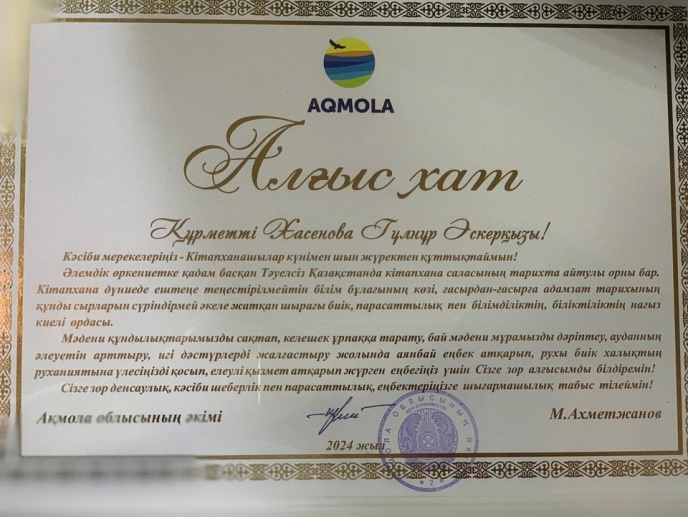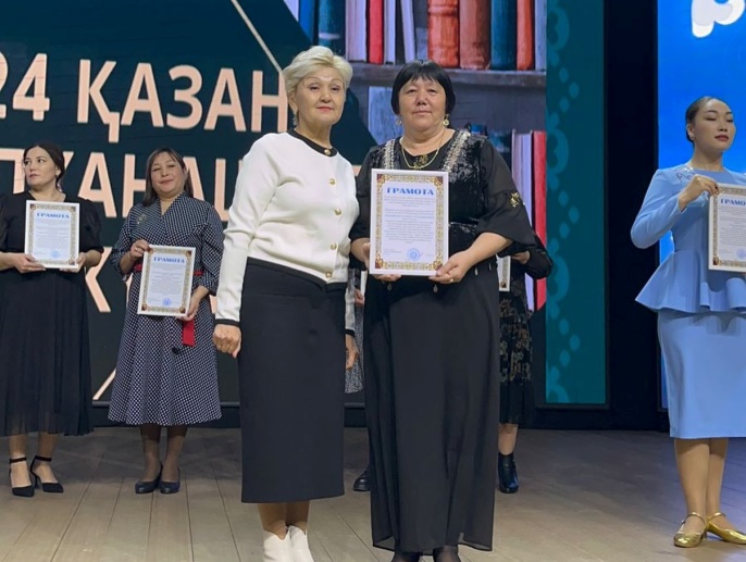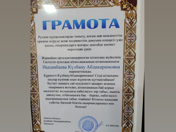 Күлбану Абдикаримовна Нысамбаева Ақмола облысы мәдениет басқармасының басшысы Айгүл Баубекқызы Сәбитованың грамотасымен марапатталды.