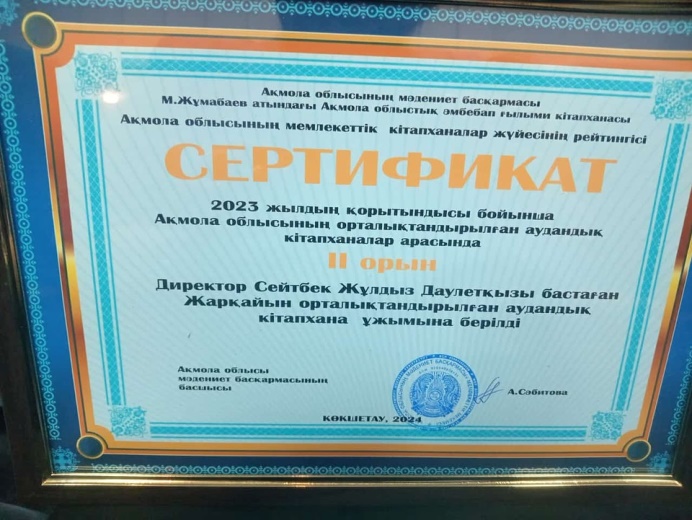 24-қазан –Кітапханашылар күніне байланысты Жарқайың ОКЖ 2023 жылдың қорытындысы Ақмола облысының орталықтандырылған аудандық кітапханалар арасында Жұлдыз Дәулетқызы Сейтбек бастаған Жарқайың орталықтандырылған кітапхана жүйесінің ұжымы 2-орын иемденсе, Жарқайың аудандық кітапхананың кітапханашысы Гүлнұр Әскерқызы Хасенова Ақмола облысының әкімі Марат Мұратұлы Ахметжановтың алғыс хатымен, Гастелло ауылдық кітапхананың кітапханашысы