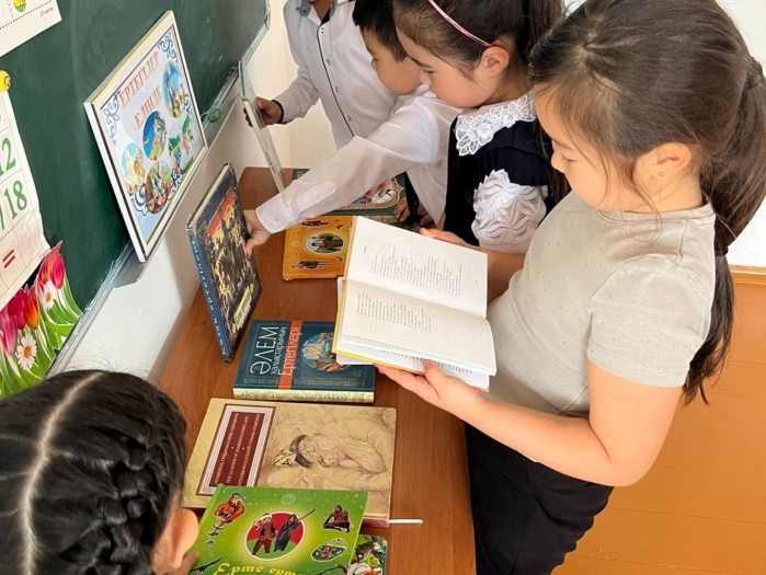 Балалар назарына «Ертегілер елінде» атты кітап көрме құрылды, көрмеге шолу жасалды.