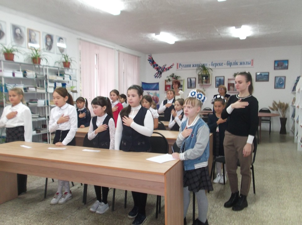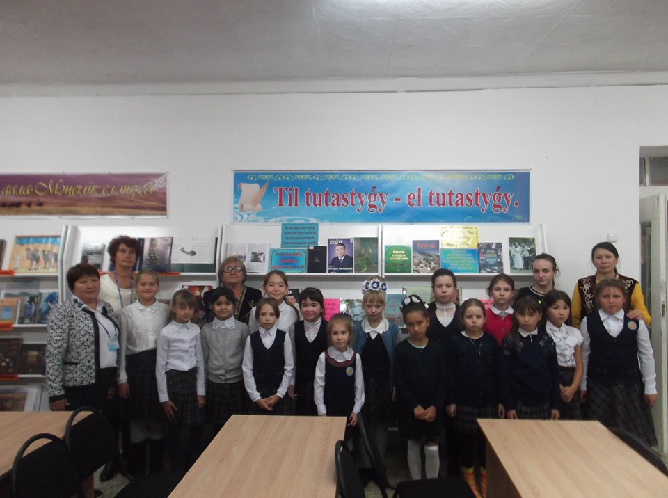 Вниманию ребят была оформлена выставка книг «Тіл тұтастығы – ел тұтастығы »,провели обзор выставки, подарила памятные подарки.